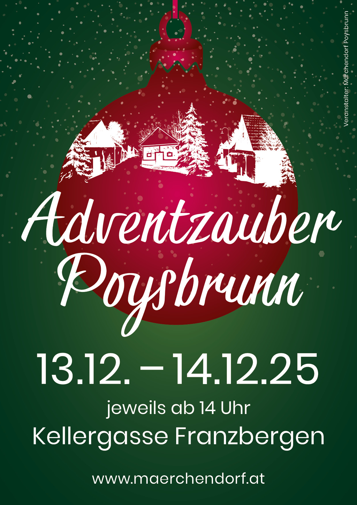 Kellergasse 2161 Poysbrunn, ÖsterreichMärchenhafter Adventzauber im Märchendorf Poysbrunn 13. + 14.12.2025 jeweils ab 14 Uhr in der Kellergasse Franzbergen Die kleine romantische Kellergasse Franzbergen wird zu einem Wintermärchen. Die weihnachtlich geschmückten Keller warten mit einer erlesenen Auswahl an Ausstellern und einer Vielzahl an kulinarischen Köstlichkeiten auf. Freuen Sie sich mit uns auf handwerkliche Besonderheiten wie ausgefallene Weihnachtsdeko, vieles aus Holz,… Weiterlesen »Adventzauber Poysbrunn 2025